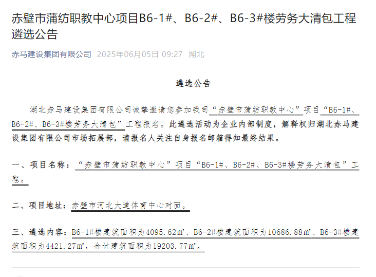 赤壁市蒲纺职教中心项目B6-1#、B6-2#、B6-3#楼劳务大清包工程遴选公告